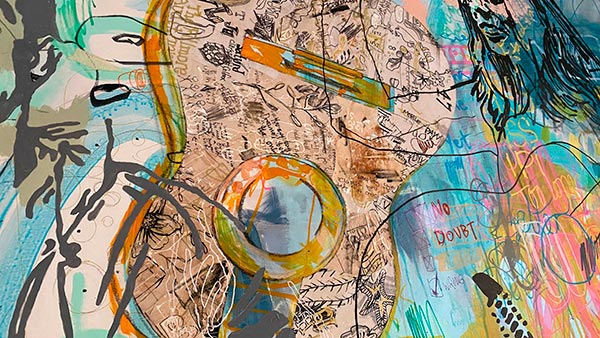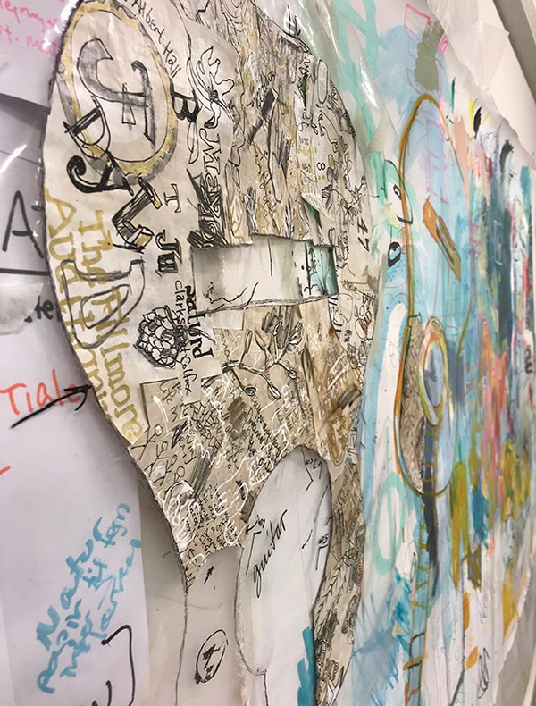 Det er en form, bygget af papirudklip og limet direkte på lærred.